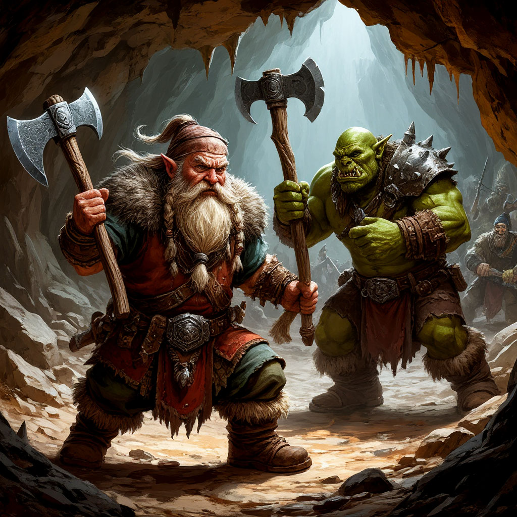 В этот раз обморок продлился не так долго, но слабость, которая нахлынула лавиной на Лёню, уходить не собиралась. Мысль плавно ворочалась в голове, напоминая муху, которая пытается плавать в глицерине. Сквозь плотную завесу накатившего безразличия до Лёни не доходили крики командира, хотя тот очень старался докричаться до упавшего гнома. - Нагичар! Нагичар! Вставай! На нас напали орки! Орки? Какие орки? Там были гоблины! - он ещё мог удивляться, но ясность мышления всё равно не возвращалась. И тут как-будто глоток морозного воздуха хлынул в лёгкие Лёни и он дёрнувшись, раскрыл глаза и увидел над собой Бренора с боевым топором в руках. -Вставай! Скорее! Бери топор и за мной. Бренор повернулся спиной к Нагичару и рванул вон из пещеры. Чуть замешкав, Лёня выскочил за ним. Но не успел. Дорогу ему преградил зелёный человечек. Воспоминания нынешнего тела подбросили ему подсказку - это орк. Но в его представлении орки такими не бывают. Рост невысокий, практически сопоставимый с гномичьим, а