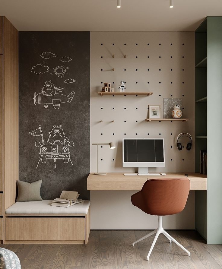 1️⃣Беспорядок на столе снижает концентрацию на 40% — мозг тратит энергию на «сортировку» хаоса; Решение простое: на столе должны быть только те предметы, которые нужны для конкретного урока. Все остальное — в ящики, на полки, в контейнеры. ✅Система хранения не роскошь, а необходимость для эффективной учебы. 2️⃣Неправильное освещение вызывает усталость уже через 20 минут занятий; Правильное освещение для детской — это комбинация общего и местного света. Настольная лампа мощностью 60-80 Вт должна стоять слева для правшей и справа для левшей. Общее освещение должно быть равномерным по всей комнате, стоит выбирать лампы нейтральной температуры 3500-4000К💡 3️⃣Яркие цвета в рабочей зоне раздражают нервную систему детей; Яркие акценты оставьте для игровой зоны. Пусть там будет сколько угодно красного, оранжевого и фиолетового. А вот рабочее место должно настраивать на серьезный лад- предпочтение нейтральным сдержанным тонам🤍🤍 4️⃣Размещение стола у окна с видом на двор создает постоянные от