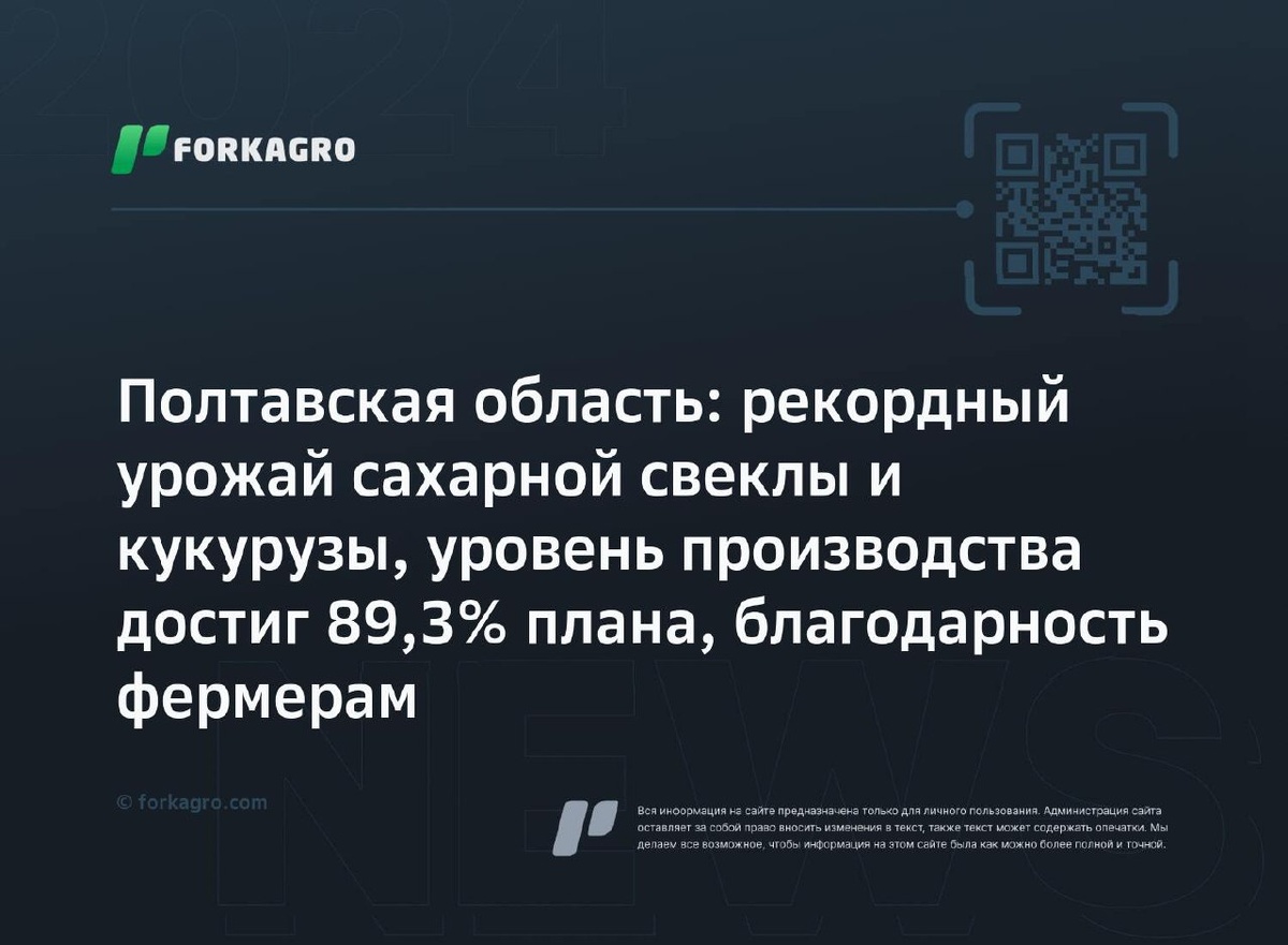 Полтавская область: рекордный урожай сахарной свеклы и кукурузы, уровень производства достиг 89,3% плана, благодарность фермерам