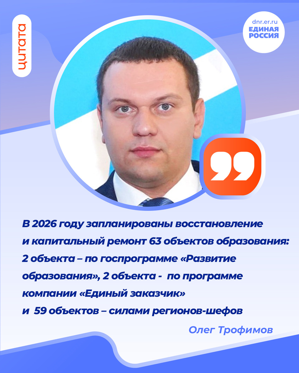Координатор партийного проекта Единой России «Новая школа» в ДНР, министр образования и науки Республики Олег Трофимов рассказал об итогах строительства и ремонта объектов образования в 2024 году и о текущих работах в 2025 году. 💬 «В 2024 году ремонтно-восстановительные работы были проведены на 211 объектах образования, включая 125 общеобразовательных школ, 82 дошкольных образовательных учреждения и 4 профессиональных образовательных организации. В 2025 году работы ведутся в 130 образовательных организациях: 63 общеобразовательные школы, 55 дошкольных учреждений и 8 объектов профессионального образования. На сегодняшний день в ходе кампании 2025 года уже восстановлено 77 объектов, в том числе 45 школ, 30 детских садов и 2 учреждения профобразования», – рассказал Олег Трофимов. ✅ Также он добавил, что уже в следующем – 2026 году запланированы восстановление и капитальный ремонт 63 объектов образования: 2 объекта – по госпрограмме «Развитие образования», 2 объекта – по программе компани
