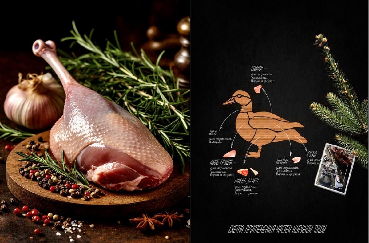Помните вот здесь мы рассказывали о классификации частей говяжьих и лосиных туш, а сегодня мы подготовили для вас Chicken guide или пост о том как правильно готовить и разделывать птицу. И главными сегодняшними героинями у нас стали - цыпленок и утка. Ведь умение правильно обращаться с птицей - это не только приготовить ее согласно рецепту. Это еще и умение правильно ее обработать. В случае с птицей разумно ее разделать. В силу того, что утка, как и цыпленок состоят из множества разных не похожих друг на друга частей, разделка ее кажется чем-то утомительным, и многим кажется, что куда лучше купить сразу грудку или голень. А вот и не лучше! В добавок, если мы говорим о дикой птице, она всегда будет целая, и грамотно ее разделав, вы сможете приготовить как множество различных блюд - часть мяса пустить в расход сразу, часть заморозить, а кости отправить в бульон, так и смешав несколько видов мяса, получить, например, замечательные котлеты, вроде «пожарских». Начинать разделку следует с кр