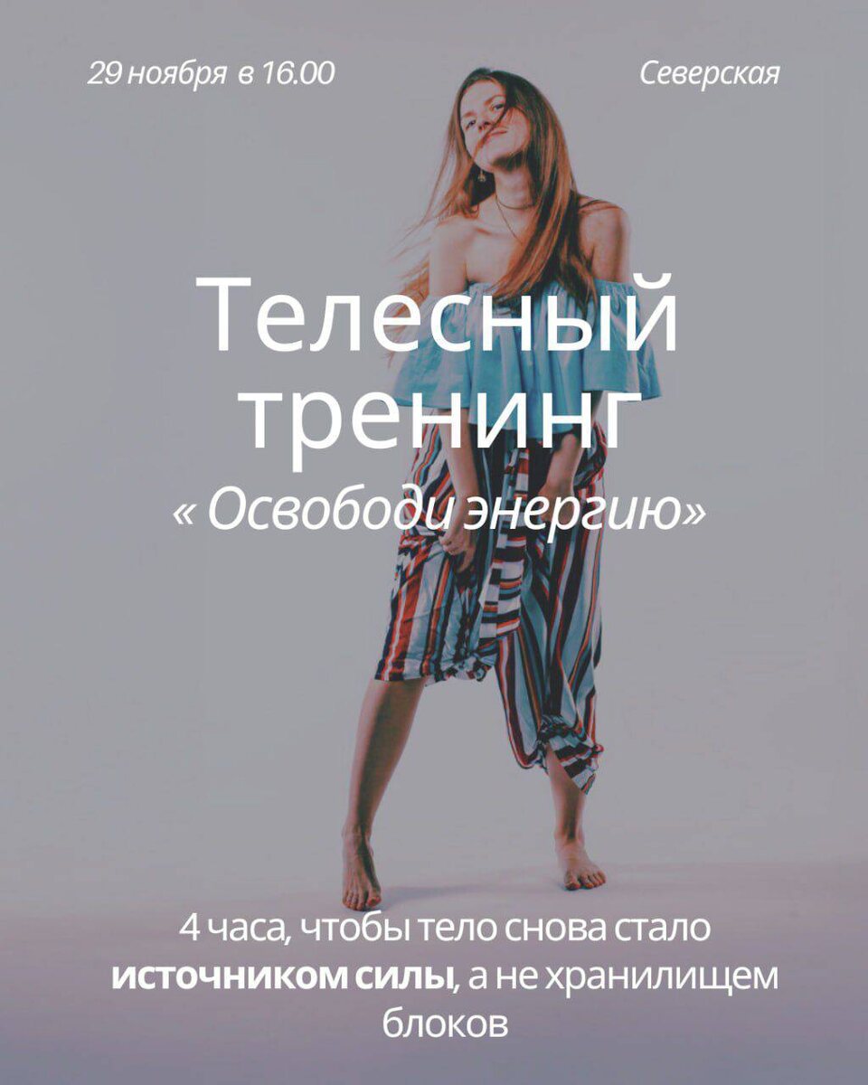 🌱 Телесный тренинг: "Освободи энергию" 4 часа, чтобы тело снова стало источником силы, а не хранилищем блоков Для кого этот тренинг: ▫️Твоё тело будто хранит груз: лишний вес, напряжение, сутулость или даже боль ▫️ Ты чувствуешь, что энергия застряла - после выгорания или трудного периода в жизни не получается восстановиться ▫️Ты не понимаешь, чего на самом деле хочешь, потому что давно не слушаешь своё тело ▫️Ты боишься своей агрессии: вдруг, если начнёшь идти за своим, "что-то пойдёт не так"? ▫️Или, наоборот, иногда чувствуешь злость, но не знаешь, как выразить её без вины или разрушения ❤️ Или ты просто чувствуешь отклик побыть в безопасной приятной атмосфере, пообщаться с телом, отдохнуть Что мы будем делать: 🌀 Телесное осознание по Фельденкрайзу - мягко, без усилий, через внимание к движению 🌬️ Дыхательные практики - чтобы растопить зажимы и вернуть поток 💃 Осознанное движение - не танец, а язык тела, через который оно может сказать: "Я хочу", "Мне больно", "Я гото