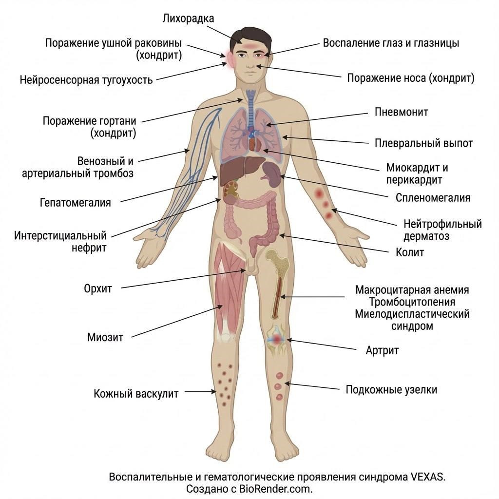 ΡΡΠ°Π½ΡΡΡΠ·ΠΈΠΉ ΡΡΠΈΡΡΠΎΡΠΈΡΠ°ΡΠ½ΠΎΠΉ ΠΌΠ°ΡΡΡ, Π° Π² Π½Π°ΡΡΠΎΡΡΠ΅Π΅ Π²ΡΠ΅ΠΌΡ β Π΅ΡΠ΅ ΠΈ ΡΡΠΎΠΌΠ±ΠΎΡΠΈΡΠΎΠΏΠ΅Π½ΠΈΡ. ΠΡΠΈ ΠΏΡΠΎΠ²Π΅Π΄Π΅Π½ΠΈΠΈ ΠΌΠΎΠ»Π΅ΠΊΡΠ»ΡΡΠ½ΠΎ-Π³Π΅Π½Π΅ΡΠΈΡΠ΅ΡΠΊΠΎΠ³ΠΎ ΠΎΠ±ΡΠ»Π΅Π΄ΠΎΠ²Π°Π½ΠΈΡ Π²ΡΡΠ²Π»Π΅Π½Π° ΡΠΎΠΌΠ°ΡΠΈΡΠ΅ΡΠΊΠ°Ρ ΠΌΡΡΠ°ΡΠΈΡ Π² Π³Π΅Π½Π΅ UBA1, ΡΡΠΎ ΠΏΠΎΠ·Π²ΠΎΠ»ΠΈΠ»ΠΎ ΠΏΠΎΠ΄ΡΠ²Π΅ΡΠ΄ΠΈΡΡ ΡΠ»ΠΎΠΆΠ½ΡΠΉ ΡΠ΅Π΄ΠΊΠΈΠΉ Π΄ΠΈΠ°Π³Π½ΠΎΠ· β ΡΠΈΠ½Π΄ΡΠΎΠΌ VEXAS, ΠΊΠΎΡΠΎΡΡΠΉ ΠΎΡΠ½ΠΎΡΠΈΡΡΡ ΠΊ Π°ΡΡΠΎΠ²ΠΎΡΠΏΠ°Π»ΠΈΡΠ΅Π»ΡΠ½ΡΠΌ Π·Π°Π±ΠΎΠ»Π΅Π²Π°Π½ΠΈΡΠΌ. Π‘Π΅ΠΉΡΠ°Ρ ΠΏΠ°ΡΠΈΠ΅Π½Ρ ΠΏΡΠΎΡ