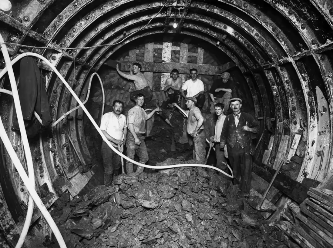 метро не копали вручную, а прокладывали механизированным щитом, который одновременно продвигался вперёд и устанавливал тюбинги.