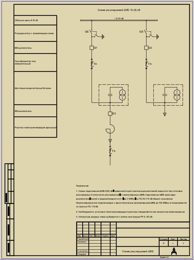 ШКБ могут подключаться к сборным шинам РУ или к линиям электропередачи. Для сетей 6–10 кВ часто используются схемы с секционированными системами шин (например, схемы 10(6)-2 и 10(6)-3), где ШКБ компенсируют реактивную мощность отдельных секций. В промышленных подстанциях ШКБ могут комбинироваться с синхронными компенсаторами или управляемыми шунтирующими реакторами для более гибкого регулирования.