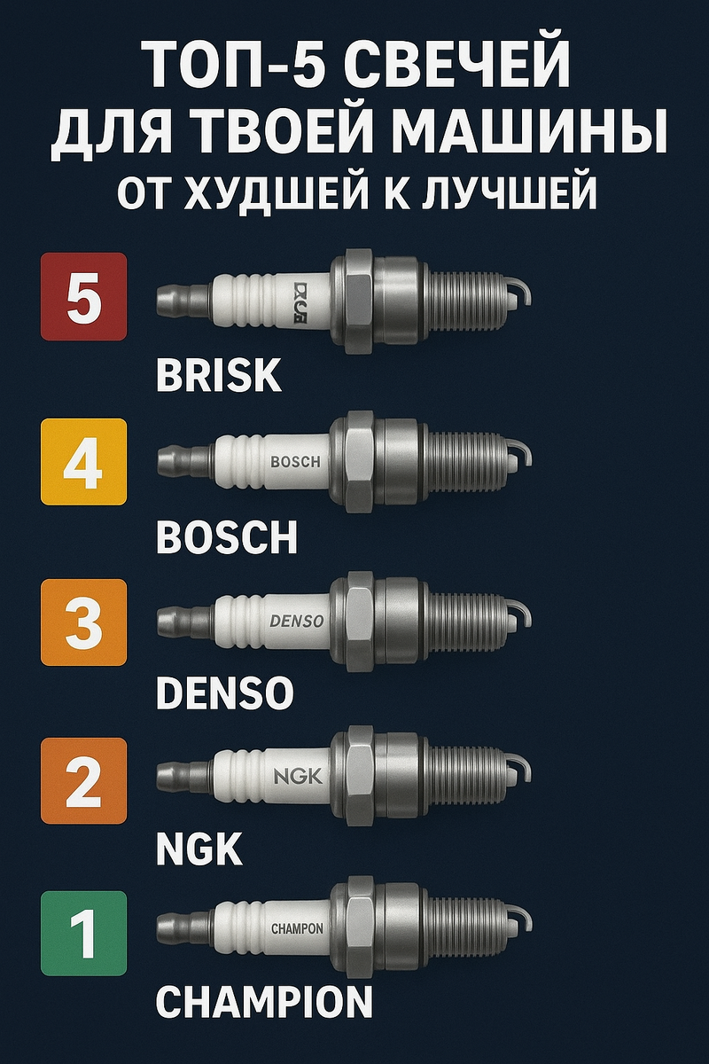 От худших к лучшим (с точки зрения ресурса, стабильности работы и отзывов механиков) 5 место — Brisk Почему худшие в списке: – ходят мало, – бывают пропуски зажигания, – чувствительны к качеству топлива. Плюсы: низкая цена. Кому подойдут: «чтобы просто заводилось», если нужно временное решение. 4 место — Bosch Почему тут: – часто подделывают, – на наших моторах иногда капризные. Но: оригинальный Bosch — неплохой середнячок. Кому подойдут: для спокойной езды на атмосферных моторах. 3 место — Denso Плюсы: – хорошие иридиевые серии, – надежный холодный старт, – живут дольше обычных. Минусы: – цена выше среднего. Кому подойдут: большинство японских и корейских машин — идеальное сочетание. 2 место — NGK Почему топ: – супер стабильная искра, – большой ресурс, – спокойно переживают плохой бензин, – ставятся на огромное количество авто с завода. Кому подходят: всем кроме редких и очень специфичных моторов. 1 место — Champion (ЛУЧШИЕ) Почему победитель: – максимально стабильная
