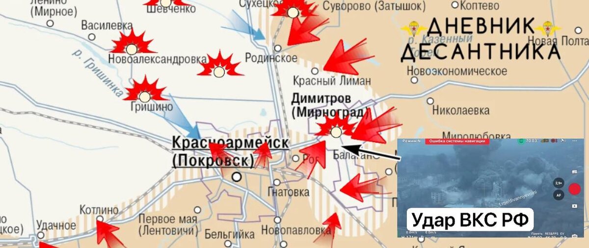 🪂 Красноармейское направление. ▫️Красноармейск. В городе продолжается зачистка от уцелевших малых групп ВСУ. ▫️Западнее у Гришино идут бои, так как противник оттянул войска в само село, хохлы здесь держат оборону, помимо этого, Гришино в свободной зоне от наших войск и логистика тут достаточно пока надежная у врага. Также отсюда идут атаки и на участок Родинское, где вражеские группы по лесопосадкам продвигаются в направлении трассы. Но это скорее жалкие попытки стабилизировать ситуацию, чем полноценные атаки. В самом Родинском наши бойцы ведут зачистку последних двух западных кварталов, где ещё остаётся хохол. ▫️Восточнее Гнатовки мы практически зачистили зону до ж/д полотна, соответственно, все хохлы, что остались зажаты в кармане у Сухового Яра шансов на выход не имеют. ▫️Также шансов на выход нет и ВСУшников из Димитрова (Мирнограда), хотя некоторые камикадзе и пытаются выйти по 2-3 человека, всех минусуем, исходя из сообщений операторов БПЛА ВС РФ с мест, выйти ещё не удалос