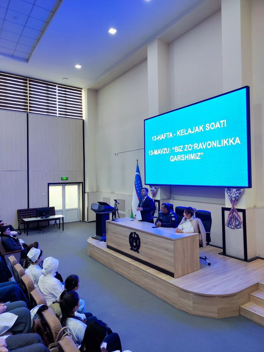 🔺Toshkent davlat tibbiyot universitetining, Tibbiy-pedagogika va davolash fakulteti talabalari uchun navbatdagi 13-hafta “Kelajak soati” darsi “Biz zo‘ravonlikka qarshimiz” mavzusida bo‘lib o‘tdi. 🔺Mashg‘ulot davomida talabalarga zo‘ravonlik tushunchasi, uning jismoniy, ruhiy, jinsiy, iqtisodiy va ijtimoiy ko‘rinishlari, zo‘ravonlikning salbiy oqibatlari va oldini olishga qaratilgan psixologik, huquqiy choralar haqida batafsil ma’lumot berildi. 🔺Tadbirda Toshkent davlat tibbiyot universiteti YoBIB dekan o‘rinbosari A.Xudayberdiyev, profilaktika inspektori, podpolkovnik K.Xusniddinov mavzu yuzasidan talabalarga muhim ma’lumot va tavsiyalar taqdim etdilar. Ular yoshlar o‘rtasida huquqiy madaniyatni oshirish, zo‘ravonlikning oldini olish va jamoada sog‘lom muhitni shakllantirish bo‘yicha fikr almashdilar. 🔺Dars jarayonida mavzuga oid videokontentlar namoyish etildi. Talabalar faol ishtirok etib, o‘z fikr-mulohazalarini bildirib, zo‘ravonlik holatlarini aniqlash va ularga to‘g‘ri m