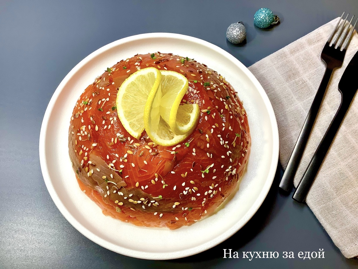 Торт-салат с красной рыбой, креветками и авокадо станет настоящим украшением новогоднего стола. Нежное сочетание соленой рыбы, сливочного сыра и авокадо порадует даже самых взыскательных гурманов. Такой салат можно приготовить в форме с плоской поверхностью и бортиками, тогда получится прямоугольный торт- салат. Но мне больше симпатичен салат в форме горки, когда рыба выкладывается по стенкам глубокого салатника и наполняется ингредиентами. Нежная текстура и маслянистый вкус авокадо в этом салате идеально сочетаются с красной рыбой и сливочным сыром. Авокадо можно нарезать кубиками и добавить в один из слоев или приготовить из него пюре и использовать в качестве соуса. Чтобы авокадо не потемнело, его нужно сбрызнуть лимонным соком. Ингредиенты: • Сёмга или любая другая красная рыба (лучше слабосоленая) - 250 г