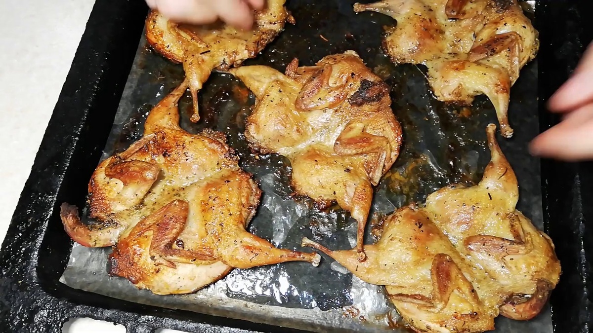 Поставьте в духовку на 15–20 минут. - Соус:После первых 15–20 минут выньте противень, переложите перепелок в центр, чтобы проверить готовность. При необходимости продолжайте запекать ещё 5–10 минут, пока мясо не станет белым, соки прозрачными, а плоть не будет отделяться от костей.