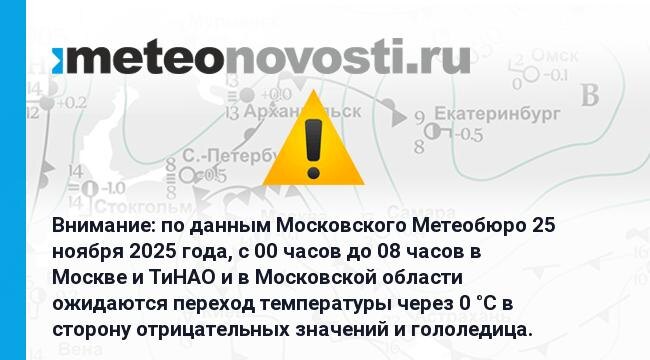 Внимание: по данным Московского Метеобюро 25 ноября 2025 года, с 00 часов до 08 часов в Москве и ТиНАО и в Московской области ожидаются переход температуры через 0 °C в сторону отрицательных значений и гололедица. Перейти на сайт Прогноз погоды на 14 дней