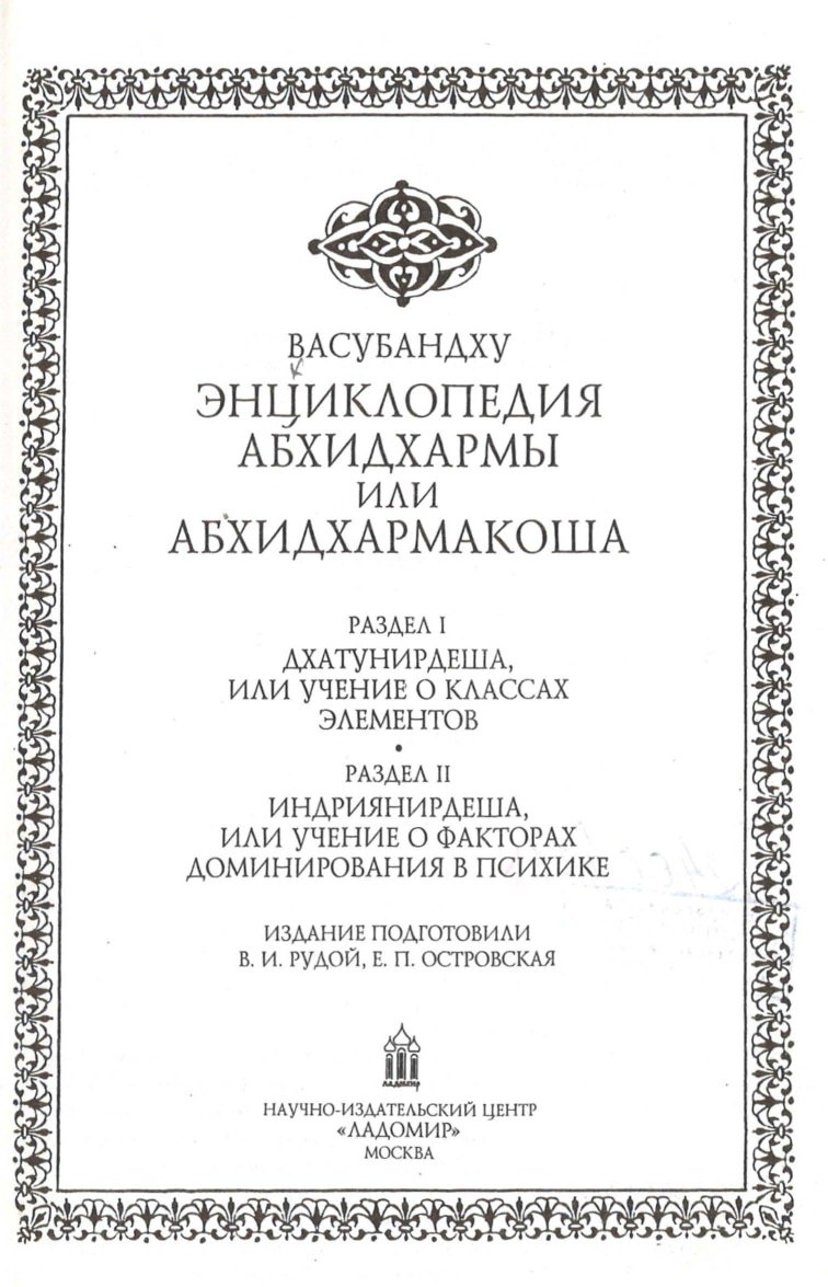🇮🇳📖 Васубандху Энциклопедия Абхидхармы или Абхидхармакоша: Разд.1: Дхатунирдеша, или Учение о классах элементов. Разд.2: Индриянирдеша, или Учение о факторах доминирования в психике / Васубандху; Изд. подгот. В.И.Рудой, Е.П.Островская; Пер. с санскрита, введ., коммент. и реконструкция системы Е.П.Островской и В.И.Рудого. - Москва: Ладомир, 1998. - 669 с.: ил. - (Серия Ex Оriente lux). - Авт. и загл. также на яз. санскрит.- На обл. загл.: Абхидхармакоша.- Библиогр. с. 108-113, 288-294 и 643-645. - ISBN 5-86218-280-2. Предметная рубрика: Философия • Буддизм • Индия • 🕉 👉 Читать книгу #bookzealots