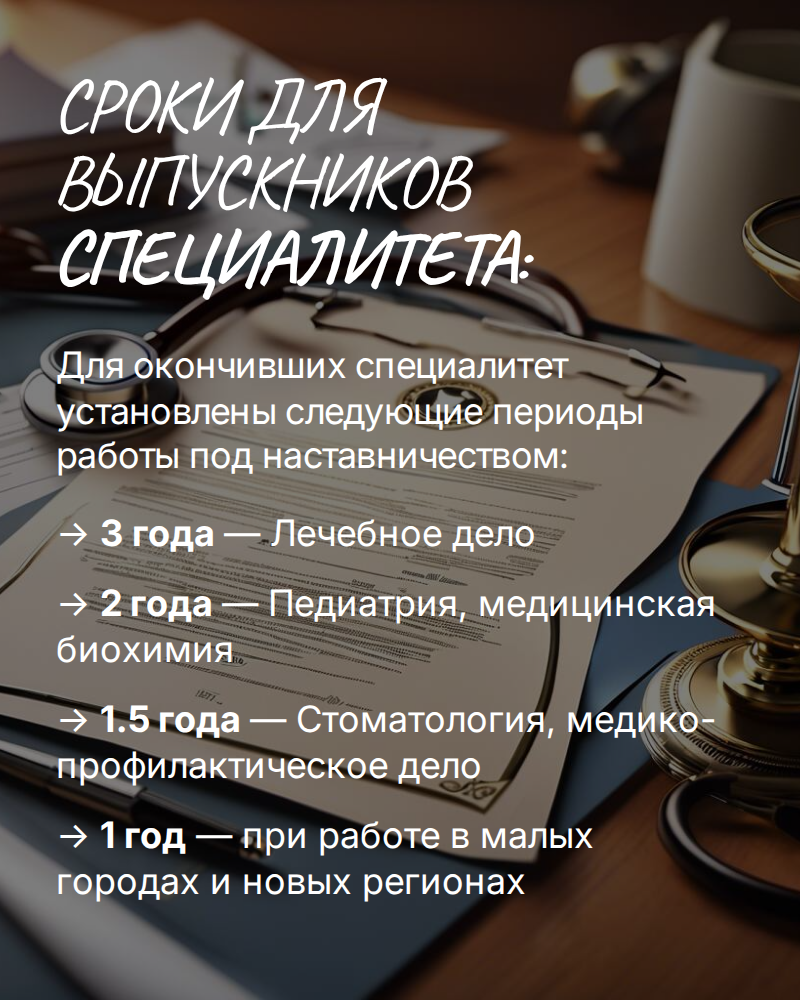 Новость, которую мы все ждали с напряжением, обрела конкретику. Минздрав определил порядок того, что официально называется «наставничеством». Документ подтвержден, цифры есть. Давайте разбираться, сколько придется отрабатывать молодым врачам, кого это коснется и, самое главное, какие правовые последствия ждут тех, кто откажется. • 3 года: Лечебное дело. • 2 года: Педиатрия, Медицинская биохимия. • 1,5 года: Стоматология, Медико-профилактическое дело, Медицинская кибернетика. Сроки варьируются от 1,5 до 3 лет в зависимости от дефицитности специальности. ⚪Максимальный срок (3 года): семь специалистов — детские хирурги, неонатологи, онкологи, пластические хирурги, сердечно-сосудистые хирурги, терапевты и торакальные хирурги. ⚪Средний срок (2 года): Самый большой блок (54 специальности), включая акушерство и гинекологию, анестезиологию, кардиологию, неврологию, психиатрию, хирургию и др. ⚪ Минимальный срок (1,5 года): Сюда попали 20 специальностей, в том числе дерматовенерология, космет