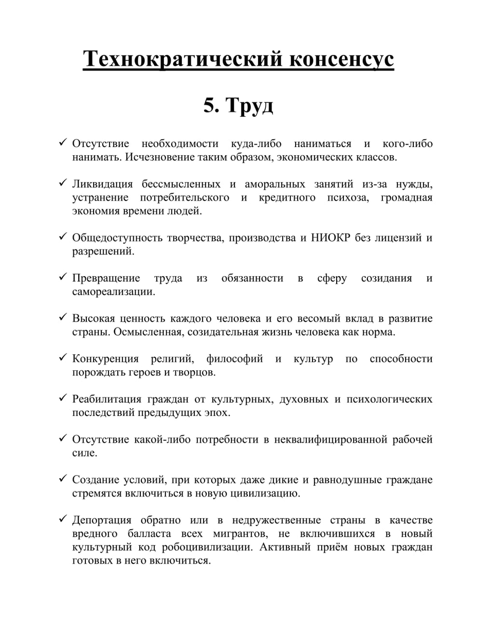 ✔️ Отсутствие необходимости куда-либо наниматься и кого-либо нанимать. Исчезновение таким образом, экономических классов. ✔️Ликвидация бессмысленных и аморальных занятий из-за нужды, устранение потребительского и кредитного психоза, громадная экономия времени людей. ✔️ Общедоступность творчества, производства и НИОКР без лицензий и разрешений. ✔️ Превращение труда из обязанности в сферу созидания и самореализации. ✔️ Высокая ценность каждого человека и его весомый вклад в развитие страны. Осмысленная, созидательная жизнь человека как норма. ✔️ Конкуренция религий, философий и культур по способности порождать героев и творцов. ✔️ Реабилитация граждан от культурных, духовных и психологических последствий предыдущих эпох. ✔️ Отсутствие какой-либо потребности в неквалифицированной рабочей силе. ✔️ Создание условий, при которых даже дикие и равнодушные граждане стремятся включиться в новую цивилизацию. ✔️ Депортация обратно или в недружественные страны в качестве вредного балласта всех мигр