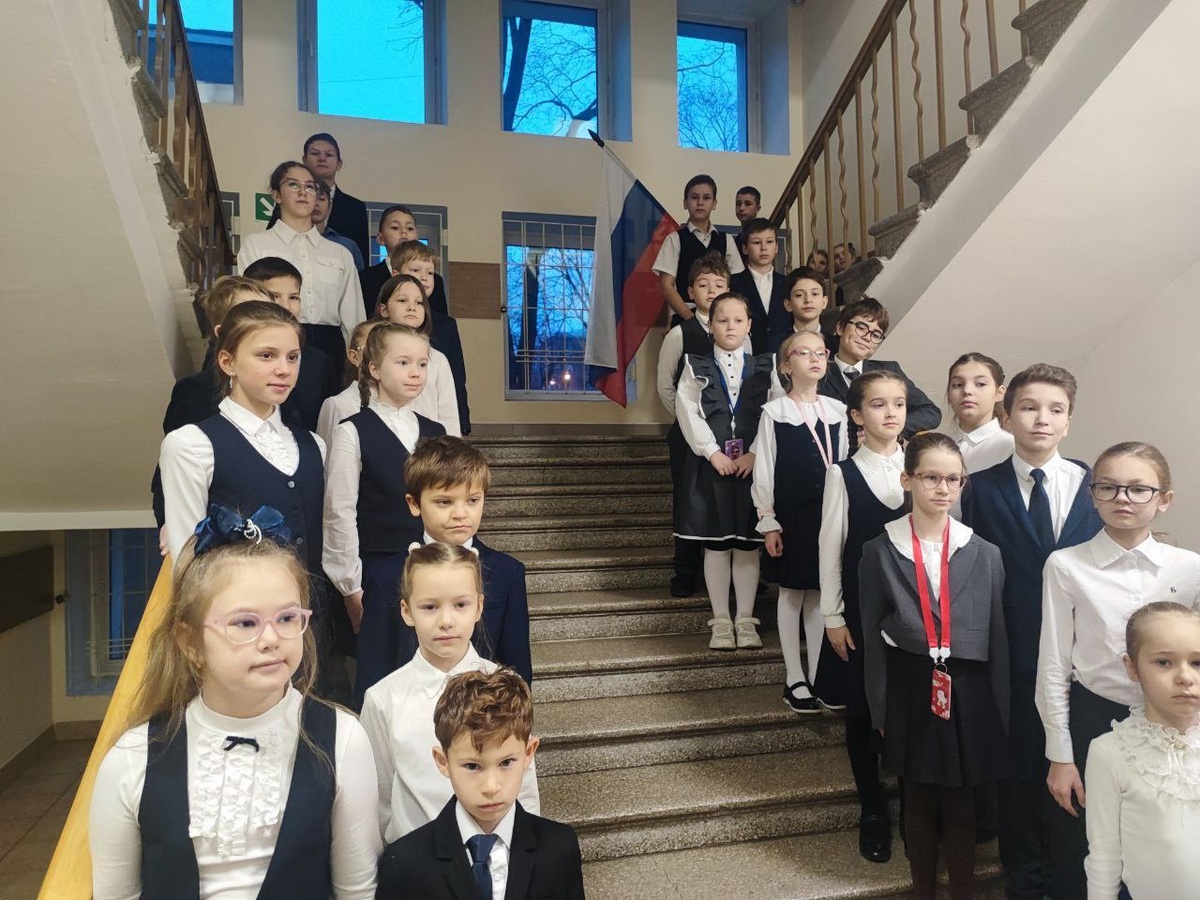 🇷🇺 Равнение на флаг! Новую учебную неделю начинаем с церемонии выноса флага Российской Федерации. Знаменная группа 2-Б и 6-Д классов Волкова Василиса и Дорошкевич Стефания являются отличниками в учебе, победителями Олимпиады «Музеи. Парки. Усадьбы», участниками Санкт-Петербургской математической Олимпиады, Василиса - постоянный участник различных флешмобов школьного телеграмм-канала; Бизяев Степан - дипломант 1 степени Олимпиады ЦПМ и «РобоСтеп» по робототехнике, призер Московской олимпиады школьников по робототехнике за 5 класс, участник соревнований МКОР и РРО (робототехника), победитель школьного этапа Всероссийской олимпиады школьников по истории, робототехнике и информатике; призер школьного этапа ВсОШ по математике, русскому и английскому языкам, географии и биологии, член школьных сборных команд по футболу и баскетболу, обладатель серебряного значка ГТО; Емельяненко Анастасия - победитель школьного этапа ВсОШ по праву, призер школьного этапа ВсОШ по литературе, математике, и