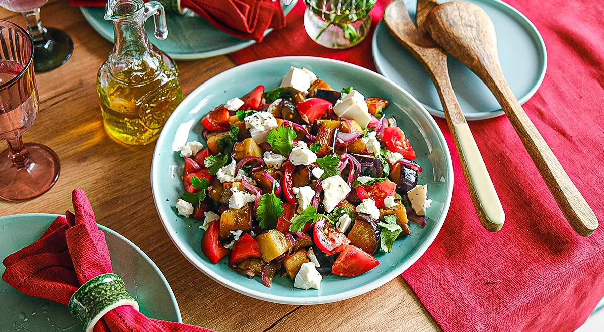 Калорийность: около 95 ккал на 100 г Теплые салаты особенно популярны в средиземноморской кухне, где овощи часто обжаривают или запекают, чтобы раскрыть их аромат и текстуру. Именно сочетание тепла и свежести делает такие блюда идеальными для любого времени года — зимой они согревают, а летом дарят лёгкость. Подавайте салат в глубокой тарелке, украсив веточками базилика. Он отлично сочетается с хрустящим багетом, кусочком запеченной рыбы или курицы. Также можно использовать его как теплую начинку для лепешек или питы. Теплый салат с баклажанами и помидорами — это аромат, вкус и уют в одной таре