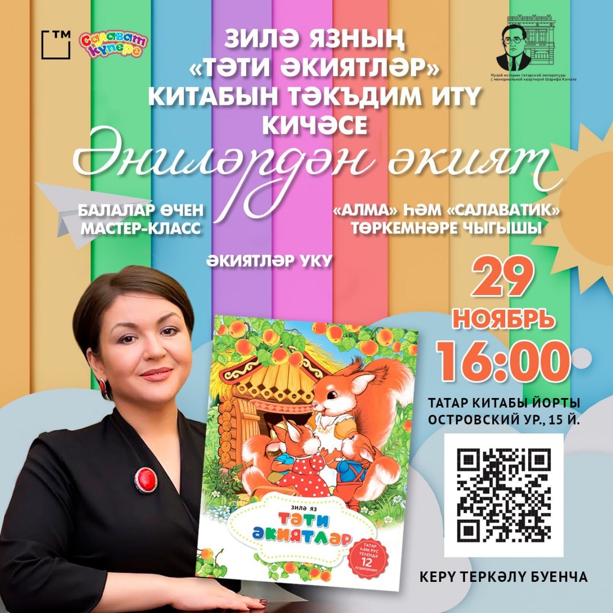 29 ноябрьдә 16:00 «Татар китабы йорты»нда 🎶🩰 музыкаль-биюле кичә узачак! Анда Зилә Язның «Тәти әкиятләр» китабы тәкъдим ителәчәк. Балаларны һәм әниләрне: 📚 әкият уку 🎻 музыка һәм җырлар 🎨 аквагрим һәм мастер-класслар көтә. Махсус кунаклар: язучылар, музыкантлар, «Салаватик» һәм «Алма» төркемнәре. Бәйрәмгә килү өчен, бу сылтама буенча теркәлегез: https://6635-a.timepad.ru/event/3688528/