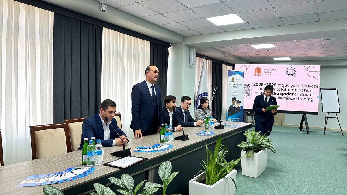 🔴live Ayni damda TDTUda “Kelajakka qadam” dasturi doirasida bitiruvchilar uchun seminar-trening bo‘lib o‘tmoqda Toshkent davlat tibbiyot universitetida 2025–2026 o‘quv yili bitiruvchi bosqich talabalari uchun “Kelajakka qadam” dasturi doirasidagi navbatdagi seminar-trening bo‘lib o‘tmoqda. Mazkur tadbir bitiruvchi yoshlarning kasbiy ko‘nikmalarini mustahkamlash, mehnat bozori talablari bilan yaqindan tanishtirish hamda muvaffaqiyatli kelajak faoliyatiga tayyorlashni maqsad qiladi. Tadbirda Universitet rektori, professor Shuxrat Boymuradov, shuningdek, “Kelajakka qadam” dasturining mehmon vakillari va bitiruvchi talabalar ishtirok etmoqda. Professor Boymuradov o‘z nutqida yosh mutaxassislarni zamonaviy tibbiyotning global o‘zgarishlari, innovatsion yondashuvlar va sog‘liqni saqlash tizimidagi yangi imkoniyatlar bilan tanishib borishga chaqirdi. Seminar-trening davomida dastur vakillari tomonidan talabalarga kasbiy yo‘nalish, mehnat bozori tendensiyalari, rezyume tayyorlash va ishga