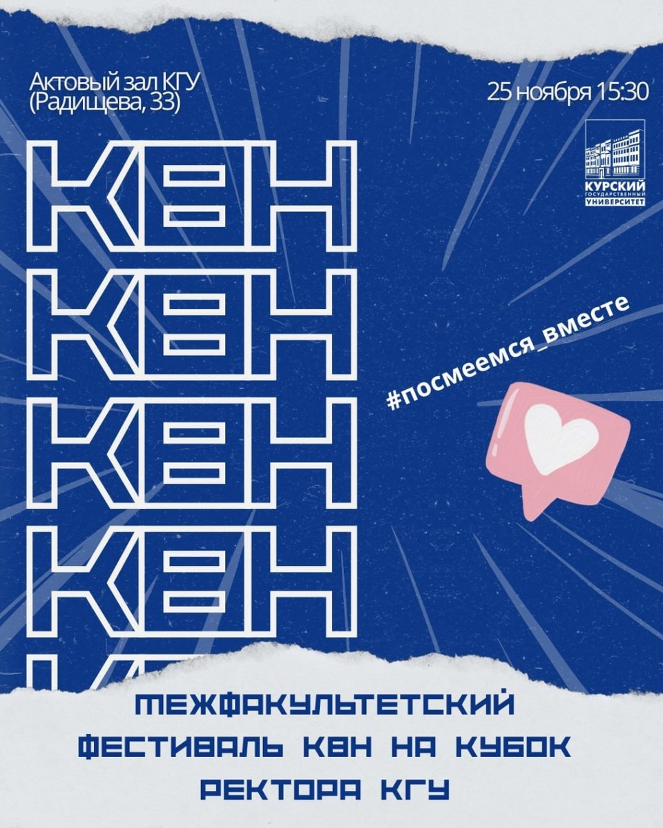 КВН в КГУ🎤 🗒25 ноября 15:30 📍Актовый зал КГУ (2 этаж, ул. Радищева, 33) Соревнование в остроумии, импровизации и умении держать зал - кажется, такое невозможно? Нет, студентам КГУ подвластно все! Талант, юмор и легкая студенческая дерзость соберутся воедино уже завтра - на межфакультетском фестивале КВН на Кубок ректора. Скучать не придется! Приходи сам и приводи друзей! ❤️ КГУ в MAX