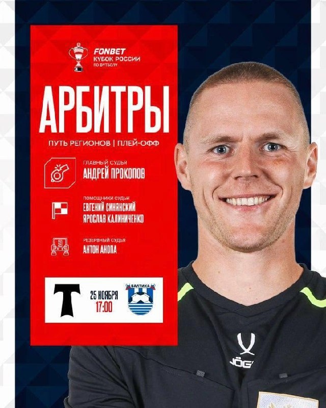 На матч «Торпедо» ⚔️ «Балтика» назначена следующая бригада арбитров: 🚩 Главный судья — Андрей Прокопов; 🏳 Ассистенты судьи — Евгений Синянский и Ярослав Калиниченко; 🔄 Резервный судья — Антон Анопа. В качестве главного судьи Андрей Сергеевич ещё ни разу не работал на матчах «Балтики». При этом арбитр в ноябре 2022 года обслужил одну игру «Балтики-2». В ней была показана одна жёлтая карточка.