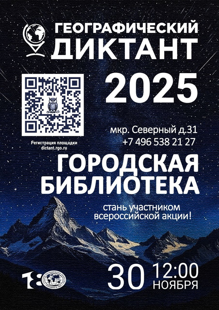 Уважаемые жители и гости города! Городская библиотека приглашает Вас принять участие в ежегодной международной просветительской акции "Географический диктант - 2025" В этом году диктант пройдет 30 ноября, начало в 12.00 Участниками Диктанта могут стать жители России и зарубежных стран, владеющие русским языком, независимо от возраста, образования, социальной принадлежности, вероисповедания и гражданства. Подробнее о диктанте можно узнать на официальном сайте clck.ru/JHygo Работа площадки 30 ноября: 11:30 – начало работы площадки; 11:45-12:00 – сбор, регистрация участников и выдача бланков для написания Диктанта; 12:00-12:15 – инструктаж по заполнению бланков для написания Диктанта; 12:15-13:00 – написание Диктанта; 13:00-13:10 – сбор заполненных бланков для написания Диктанта; 13:10 – закрытие площадки