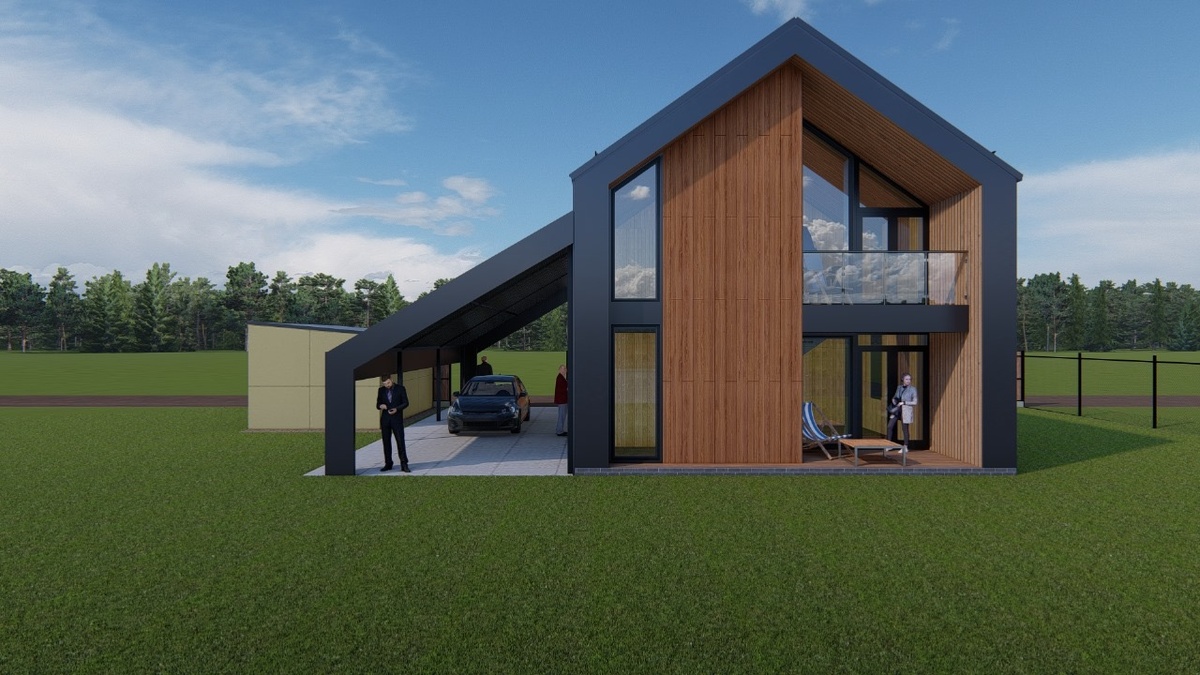 На рендере сразу видно сочетание материалов: тёмный фальц + тёплый вертикальный планкен. Оконные рамы и элементы навеса в RAL 7024.