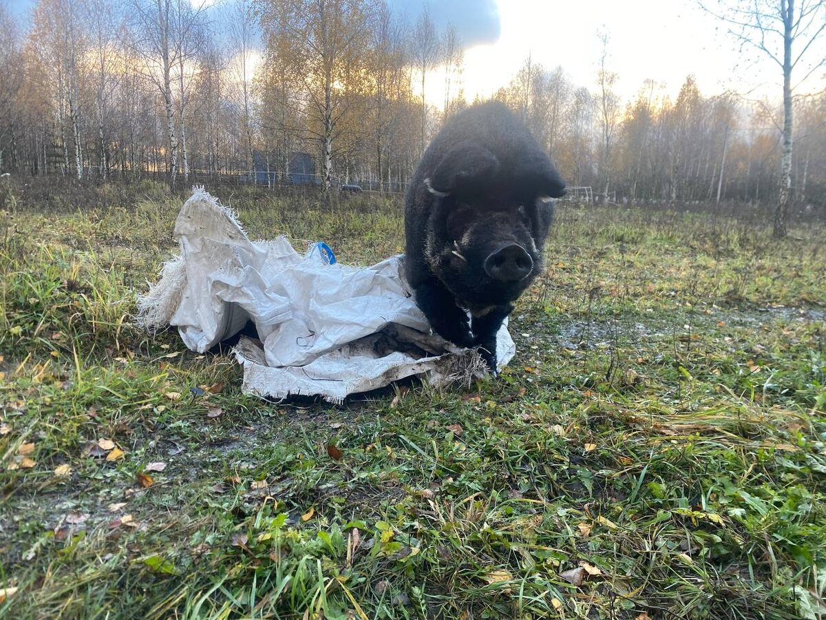 Бэкон, являясь весьма активным, высокоразвитым и любознательным существом, любит познавать мир и общаться с окружающими его созданиями. Только вот беда: большинство зверей как раз-таки не очень жаждут совместных активностей. Коням Бэкон кажется чересчур нахальным и часто нарушающим их границы (как мне это видится). Собаки побаиваются, когда кабанчик начинает от души веселиться и толкаться (еще бы! Такая клыкастая морда как боднет или такая огромная туша как снесет – мало не покажется). Козы тоже не в восторге от подобных игрищ, а с петухами и гусями Бэкону самому неинтересно. Что же касается нас, то когда он гуляет, мы обычно заняты какой-нибудь работой. Вот и приходится Бэкону самостоятельно развлекать себя. И пару недель назад во время своих прогулок он обнаружил огромные мешки, которые раньше укрывали у нас сеновал и которые сдуло ветром на землю. И кабанчик кааак набросился, как давай трепать эти мешки, как Тузик грелку – буквально. В такой раж вошел, что аж даже страшно стало. Нам