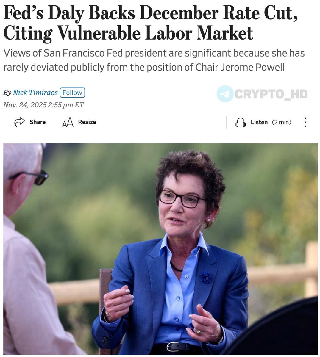 💥 WSJ: Председатель ФРС М. Дэйли (неофициальный рупор Дж. Пауэлла) поддерживает снижение процентной ставки в декабре, ссылаясь на уязвимый рынок труда. Cryptо Headlines