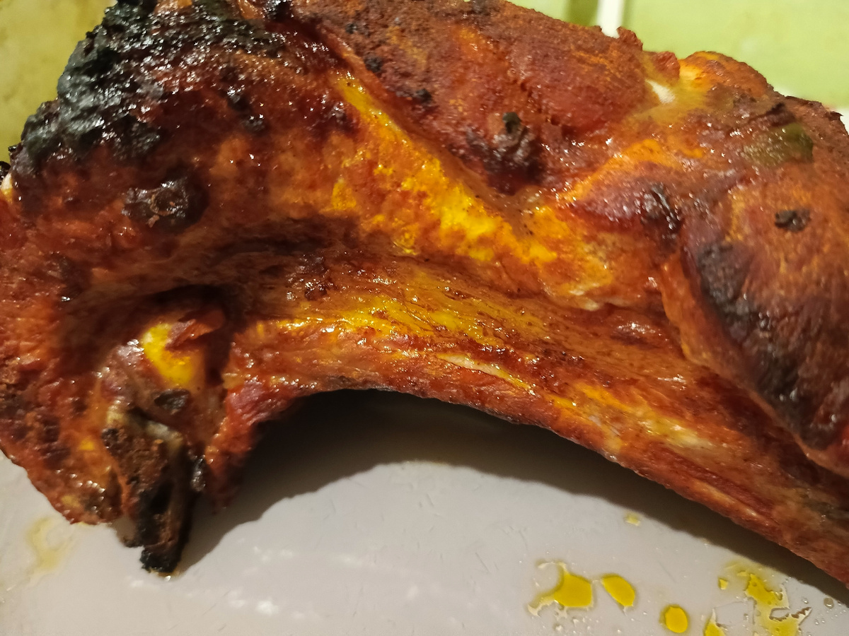 У ребер убираем пленочку, натираем специями (соль, перец, паприка копченая), и отправляем на 1.5 часа в духовку.