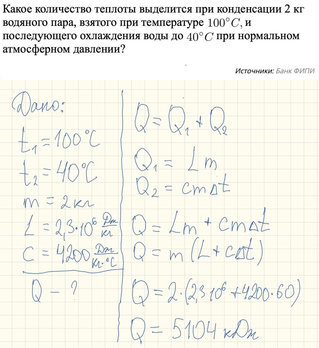 Простая задача из второй части #ОГЭ_физика №20 Какое количество теплоты выделится при конденсации 2 кг водяного пара, взятого при температуре 100°С и последующего охлаждения воды до 40°С при нормальном атмосферном давлении? Сегодня - день парообразования! #тепловые_явления #ОГЭ #физика