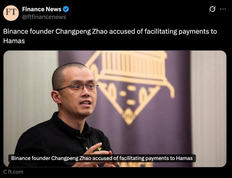 🤨 FT: Чанпэна Чжао (основателя Binanc) обвиняют в содействии финансирования ХАМАС. Cryptо Headlines