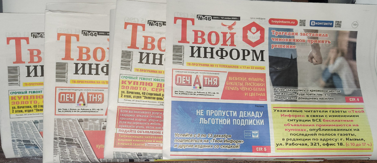 Уважаемые читатели! Газета «Твой Информ» в подписном каталоге Почты России. Это значит, что вы можете оформить подписку на наше издание в любом почтовом отделении нашей республики и онлайн, на сайте ОАО «Почта России». Попросите своего почтальона оформить подписку, если вы не можете посетить отделение Почты России. Если вы владеете компьютером, то можно оформить подписку на сайте Почты России. Для этого наберите в поисковике «Почта России. Подписка онлайн», обязательно выберите в строке региона «Республика Тыва», город, введите точный почтовый адрес, отметьте, на какие месяцы вы хотите оформить подписку, и оплатите.