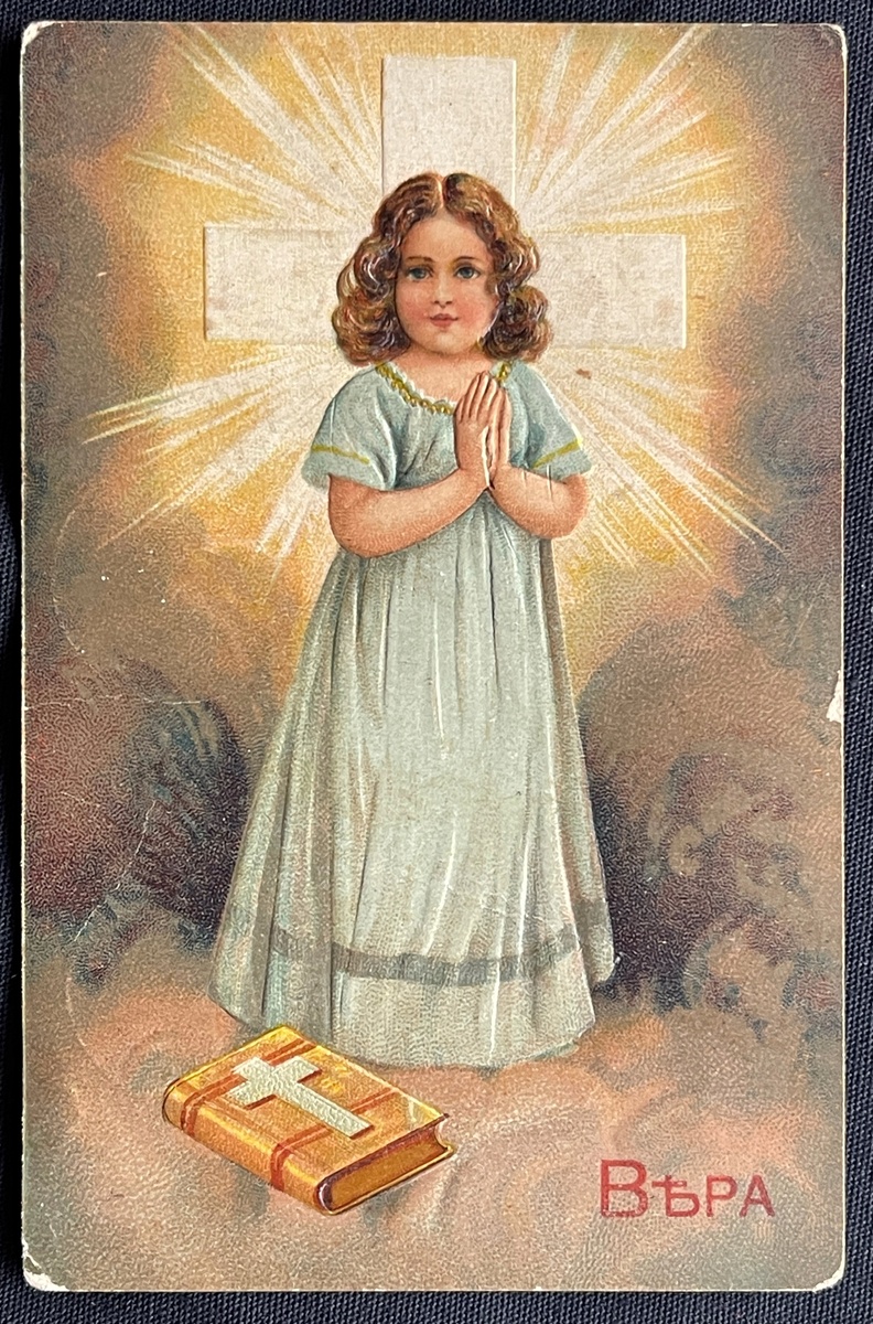 Любите рассматривать старые открытки с их непривычными для нас сюжетами? Если да, то предлагаю сегодня рассмотреть одну открыточку из моей коллекции. Это дореволюционная открытка с трогательным религиозным сюжетом под названием «Вѣра». Именно так выглядели типичные почтовые карточки начала ХХ века, выполненные в технике хромолитографии с лёгким рельефом на изображении. Давайте рассмотрим ее повнимательнее? На лицевой стороне мы видим миловидную кудрявую девочку в длинной светлой рубашке, стоящую в молитвенной позе. За её фигурой - крупный сияющий крест, яркий свет от которого расходится лучами, создавая эффект ореола. У ног девочки лежит Евангелие с накладным крестом на переплёте, символом духовного наставления. Такие открытки отправляли не только по религиозным праздникам. Их часто использовали и для семейной переписки: пожеланий здоровья, поддержки, благополучия. Сам символ«Вѣры» был очень любим отправителями и такие открытки отправляли с целью показать свое доброе отношение, по