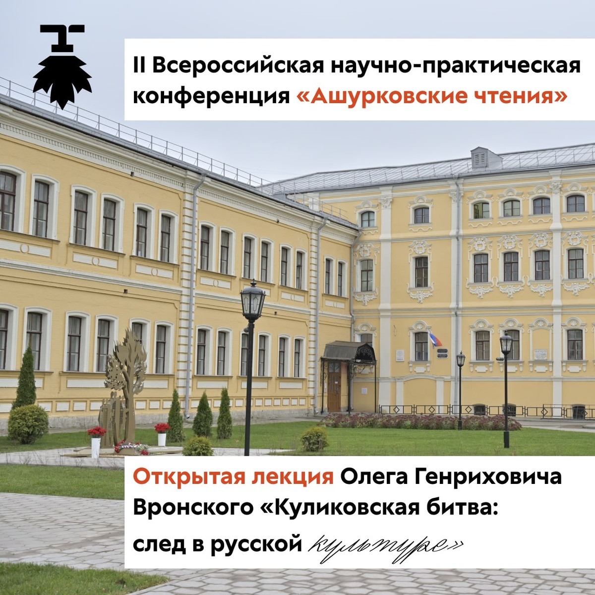🔔 Событие, которое нельзя пропустить 🔔 🎤 В Университете Льва Толстого пройдёт публичная лекция заведующего музейным комплексом «Куликово Поле», доктора исторических наук, профессора, автора книг о героях Куликовской битвы Олега Генриховича Вронского. Её тема: «Куликовская битва: след в русской культуре». ⚔️ Олег Генрихович приглашает любителей истории к размышлению о месте «побоища иже на Дону» и самого времени Дмитрия Донского в исторической памяти народа, его самосознании и «культурном коде». 📎 Подробный анонс – на нашем сайте: https://tsput.ru/news/news_university/11547/ 📆 28 ноября в 12:40 📍 Главный корпус, лекторий 4 Лекция посвящена 645-годовщине Мамаева побоища и памяти исследователя и хранителя Поля, где родилась Россия – Вадима Николаевича Ашуркова. 🍁 Подпишись на канал университета в MAX #УниверситетЛьваТолстого
