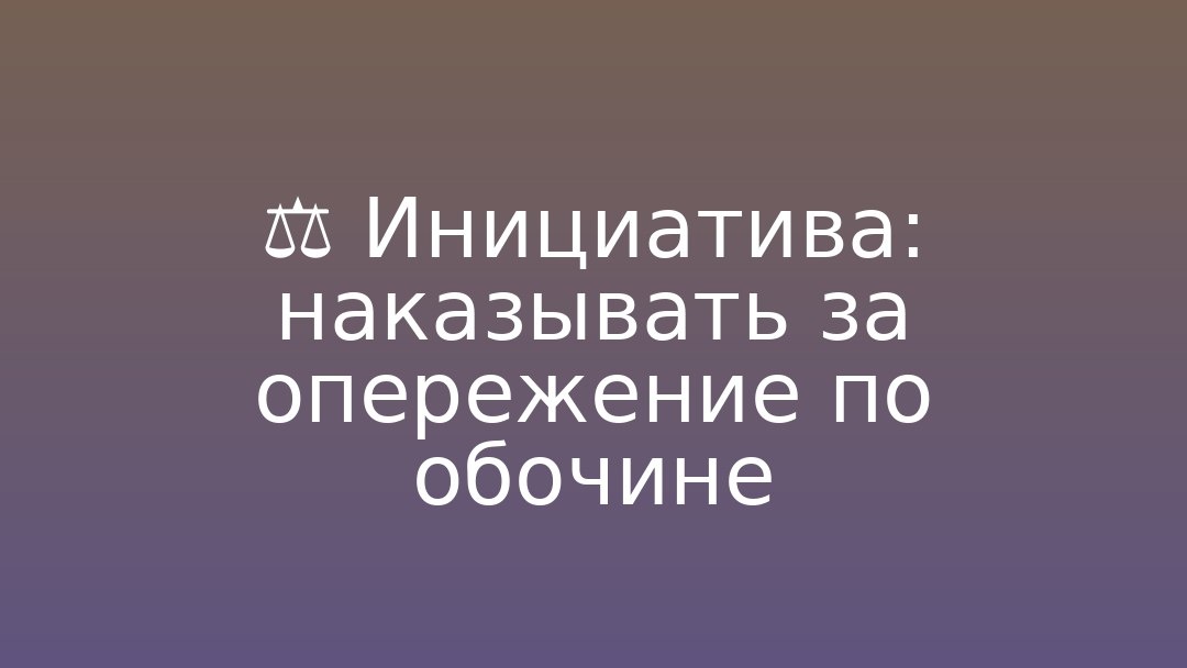 Глава комитета ГД Ярослав Нилов сообщил о проработке идеи заменить наказание за любое движение по обочине на ответственность за намеренное опережение по обочине. По его словам, современные комплексы фотовидеофиксации позволяют выявлять такие нарушения. Сначала предполагается изменить Правила дорожного движения, затем — нормы ответственности. Сейчас штраф за выезд на обочину составляет 2 250 руб.