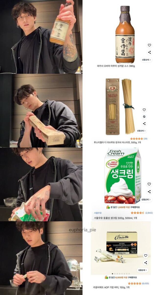 🔮 Ингредиенты которые использовал Чонгук: • Соус из икры морского ежа Wakasa Obama Marumi • Паста лингвини Rustichella d'Abruzzo • Натуральные сливки Seoul Milk (животного происхождения) • Солёное масло La Conviette AOP cr.euphoria_pie #JK @kumihobts