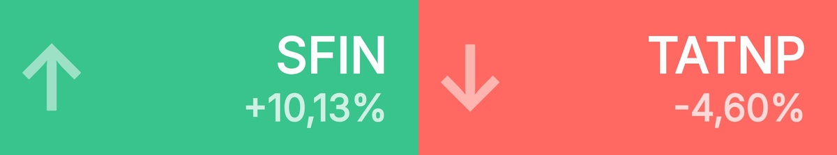 🔺 Топ-10 лидеров роста среди крупнейших акций: ЭсЭфАй • 1 665 ₽ • 10,13% М.Видео • 67,95 ₽ • 4,54% Группа Рус • 116 ₽ • 2,60% Юнипро • 1,49 ₽ • 2,26% АФК Систем • 13,26 ₽ • 1,60% Озон Фарма • 51,16 ₽ • 0,93% Аэрофлот • 54,95 ₽ • 0,44% Европлан • 568 ₽ • 0,41% НоваБев Гр • 421 ₽ • 0,33% ЕвроТранс • 131 ₽ • 0,31% 🔻 Топ-10 лидеров падения среди крупнейших акций: Татнефть п • 564 ₽ • -4,60% Татнефть • 599 ₽ • -4,25% Озон • 3 705 ₽ • -4,20% Совкомфлот • 75,57 ₽ • -3,41% Московский • 8,05 ₽ • -2,72% ВИ.ру • 69,78 ₽ • -2,61% Норильский • 129 ₽ • -2,46% ФосАгро • 6 509 ₽ • -2,43% ЭЛ5-Энерго • 0,50 ₽ • -2,29% ПИК • 451 ₽ • -2,13%