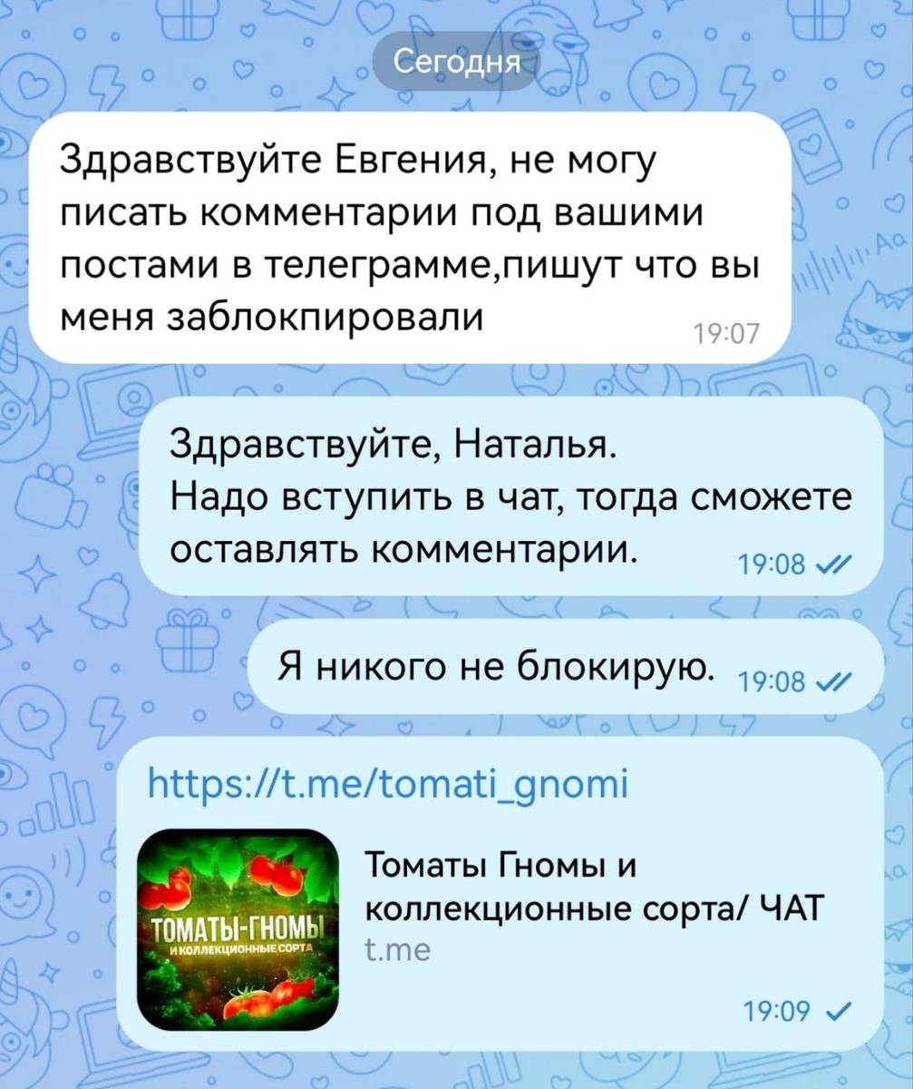 💓💓💓 Друзья, чтобы Вы смогли здесь писать комментарии и отвечать на сообщения нужно вступить в ЧАТ этого сообщества. По ссылке https://t.me/tomati_gnomi Без вступления комментарии будут Вам видны, но отвечать не сможете. Это не я придумала , это фишки телеграмма. Чтобы общение было комфортным. 😊🌹
