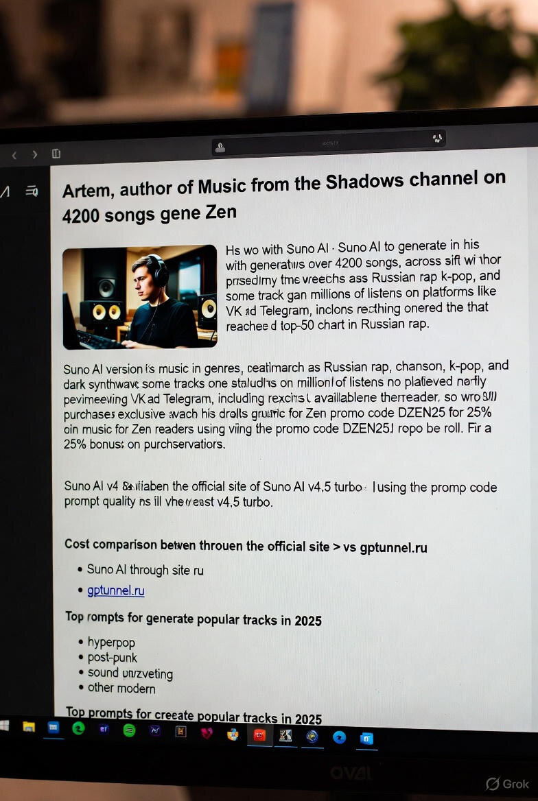 Меня зовут Артём, я автор канала «Музыка из теней» на Дзене. За последние 14 месяцев я сгенерировал более 4200 полноценных песен в Suno AI — от русского рэпа и шансона до k-pop и дарк-синтвейва. Некоторые из этих треков набрали по миллиону прослушиваний в ВК и Telegram, а один даже попал в топ-50 чарта «ВКонтакте» в жанре «русский рэп» (полностью ИИ, без единой живой ноты). В этой статье — всё, что я узнал за год ежедневной работы с Суно ИИ: от самых рабочих промптов 2025 года до того, как пользоваться v4.5 turbo почти безлимитно и в 5–6 раз дешевле официального сайта. 🔥 Эксклюзивно для читателей Дзена