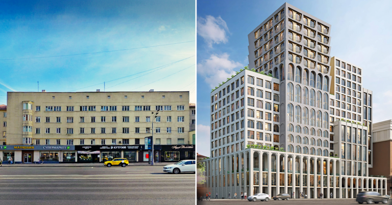 На месте конструктивистского дома на Кутузовском проспекте построят многоярусный ЖК с арками