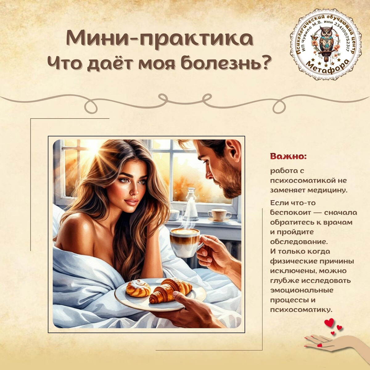 Иногда тело «включает» симптом не просто так. Да-да, бывает, что болезнь даёт скрытую выгоду: освобождает от обязанностей, защищает от конфликта, привлекает заботу. Давай попробуем это заметить прямо сейчас. Шаг 1 — Прислушайся Вспомни болезнь или симптом, который есть/был у тебя. Что он тебе давал? Например: 🟠 передышку от работы, 🟠 заботу от близких, 🟠 способ избежать конфликта. Просто заметь это, без осуждения. Шаг 2 — Определи скрытую выгоду Спроси себя: «Что получает моё тело/я через этот симптом?» «Чему помогает этот симптом в моей жизни?» Запиши одну-две самые важные выгоды. Шаг 3 — Придумай альтернативу Подумай: как можно получить ту же выгоду без болезни? Пример: 💡 Нужно внимание → прямо попросить о помощи. 💡 Нужна передышка → взять паузу, делегировать задачу. 💡 Избежать конфликта → честно обсудить ситуацию. Запиши одну альтернативу, которую можешь попробовать сегодня. 💡 Совет: Попробуй применить альтернативу хотя бы раз за день и заметить, что меняется в теле и эмоциях