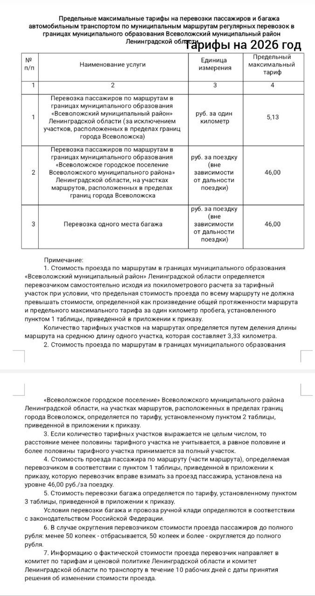 Тарифы на перевозки пассажиров и багажа по муниципальным маршрутам Всеволожского района вырастут на 2026 год Перечисленные тарифы являются предельными максимальными тарифами. То есть стоимость поездки перевозчиком может быть установлена ниже, но не может быть установлена выше указанных тарифов. 🌇 Жизнь в Кудрово Есть новости? Пишите сюда.