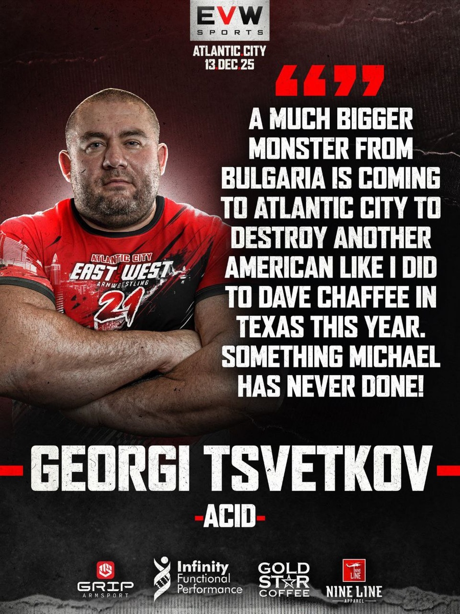 ☄️ Георгий Цветков о своём предстоящем выступление против Майкла «Монстра» Тодда: Гораздо более крупный монстр из Болгарии приедет в Атлантик-Сити, чтобы уничтожить еще одного американца, как я сделал это в этом году с Дейвом Чаффи в Техасе. Такого Майкл никогда не видел! ❓ Сможет ли Цветков 13 декабря выиграть ещё одного американца ? 🔥 - несомненно ♾ 🏆 - не думаю Наш канал | Чат | Магазин @MusiSs_Sport_bot #armwrestling #GeorgiTsvetkov #EvW