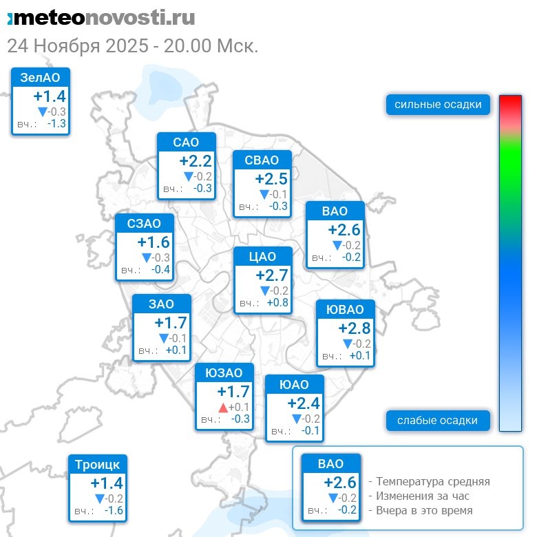 В 20:00 в Москве было от +0.8°C до +2.9°C, средняя температура +2.2°C #погода #Москва #осень #температура #24ноября #понедельник Перейти на сайт Прогноз погоды на 14 дней