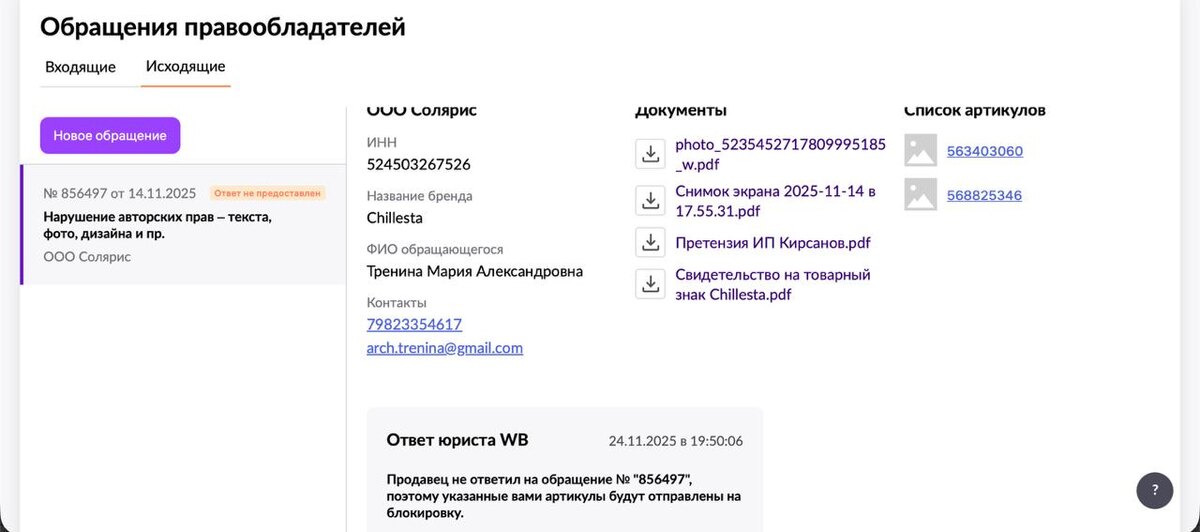 Если кто-то ворует вашу карточки/идеи/инфграфику - жалуйтесь. Через "Обращение правообладаталей". Зло должно быть наказано) На мою жалобу ответили cпустя неделю. Точнее сам продавец проигнорировал, а ВБ отреагировал блокировкой его карточек (cм. скрин)