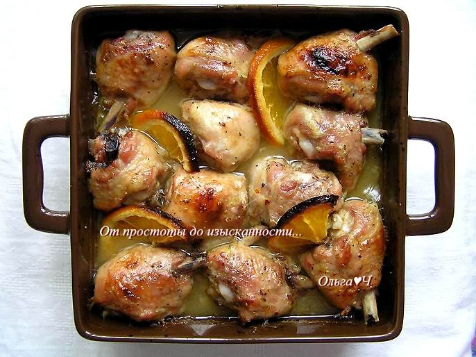 1 ст. л. мятного сиропа 1 ст. л. растительного масла Приготовление: Куски курицы посолите, поперчите, выложите в смазанную маслом форму для запекания. Апельсин разрежьте пополам, из одной половинки выжмите сок, добавьте сок лимона, растительное масло и мятный сироп, перемешайте. Залейте курочку соусом. Вторую половинку апельсина нарежьте дольками, разложите сверху. Запекайте при 200-210*С около 45-50 минут до готовности. Периодически поливайте курочку образующимся соусом. Приятного аппетита! Вам также могут понравиться: