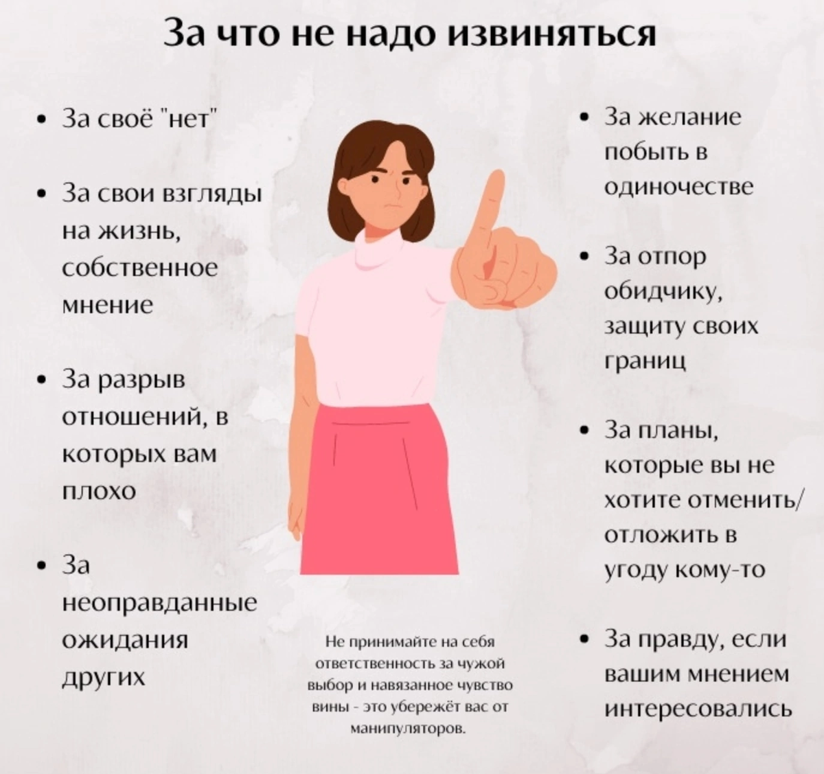 Совсем недавно, в статье https://dzen.ru/a/aSSUCpN7MEjd-BNK, я поведала вам о трех вещах, которые не требуют наших извинений. Так как мы имеем полное на них право. Сегодня я хочу дополнить этот список. И начну с Вашего