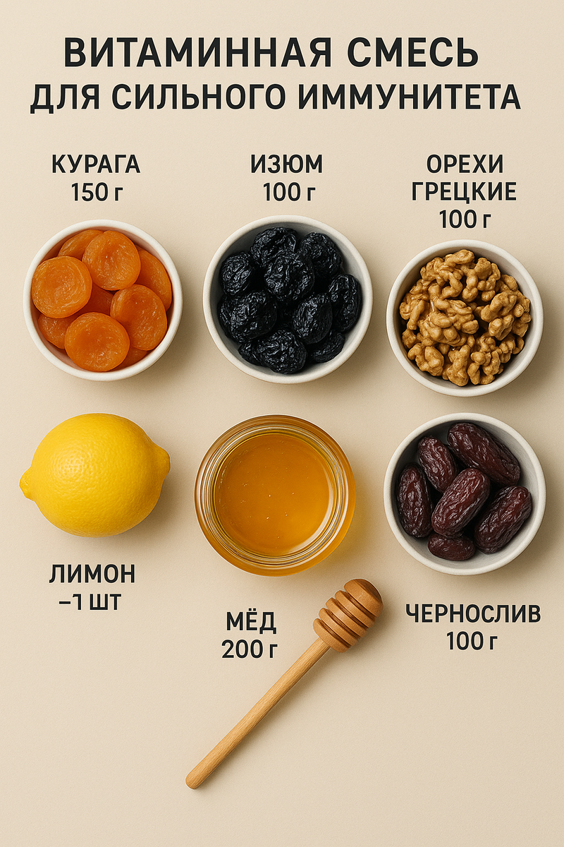 Осень, зима, да и весной частенько организм просит помощи — усталость, сонливость, нехватка витаминов. И вот тут включается настоящая витаминная смесь для сильного иммунитета, которую легко приготовить дома из простых продуктов. Она вкусная, натуральная и работает лучше многих покупных добавок. 🥄 Почему эта смесь так хорошо работает Классическое сочетание кураги, изюма, чернослива, грецких орехов, лимона и мёда — это не просто сладкая паста. Это мощный набор природных витаминок: укрепляет иммунитет улучшает работу сердца повышает энергию нормализует пищеварение помогает восстановиться после болезней А главное — это вкусно. Реально вкусно. 🛒 Ингредиенты: Курага — 150 г Изюм — 100 г Чернослив — 100 г Грецкие орехи — 100 г Лимон — 1 шт. Мёд — 200 г 👩🍳 Как приготовить витаминную смесь 1. Промой сухофрукты и просуши их. 2. Удали косточки из чернослива (если есть). 3. Пропусти куругу, изюм, чернослив и лимон с кожурой через мясорубку или измельчи в блендере. 4