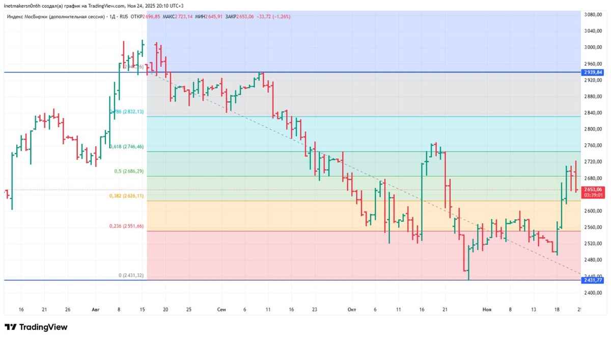 24 ноября российский фондовый рынок ушел вниз, индекс МосБиржи подешевел на 1,12% до уровня 2654,84