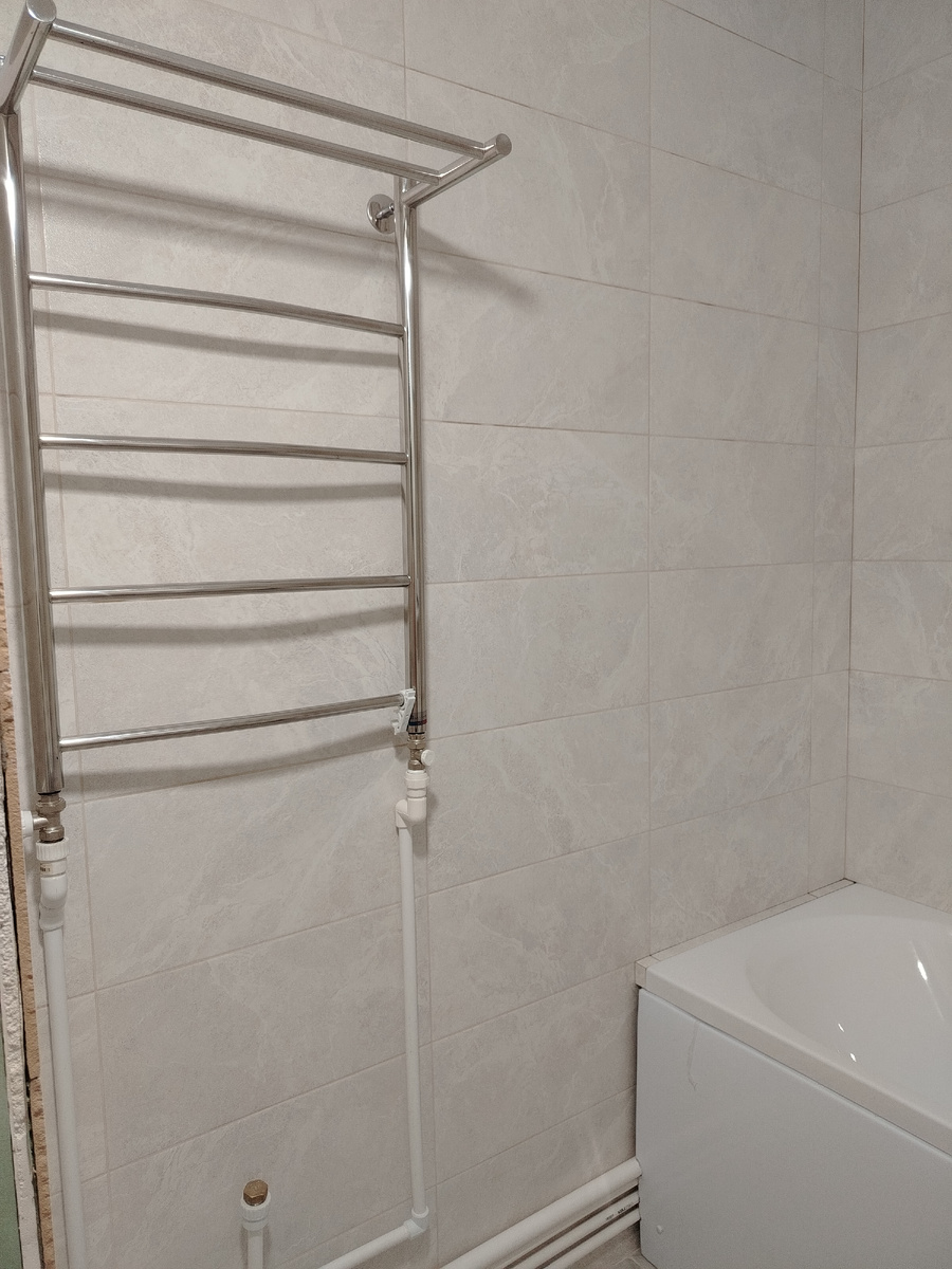Вот и подошел к концу очередной проект в живописном и спокойном городке - Приморский. Изначально наши задачи ограничивались укладкой плитки на пол в кухне, прихожей, туалете и ванной, а также оформлением фартука на кухне и стен в ванной. Планировалось, что трубы будут проложены поверх плитки. Однако, как это часто бывает, в процессе работы возникли дополнительные задачи. Мы сделали скрытую прокладку труб и канализации в стенах, заменили все металлопластиковые трубы на полипропиленовые, обновили канализационные стояки, перенесли розетки и полотенцесушитель. В этом месте заказчик все таки решил оставить трубы поверх плитки. Под полотенцесушителем будет стоять стиральная машина, она закроет вид на эти трубы. Также мы установили ванну, унитаз, умывальник, зеркало и все смесители. И стало так. А вначале было так. Процесс... В туалете появился короб из гипсокартона с ревизионным люком. Унитаз подключили, но к полу не стали крепить, так как ещё надо делать что то со стенами. Туал